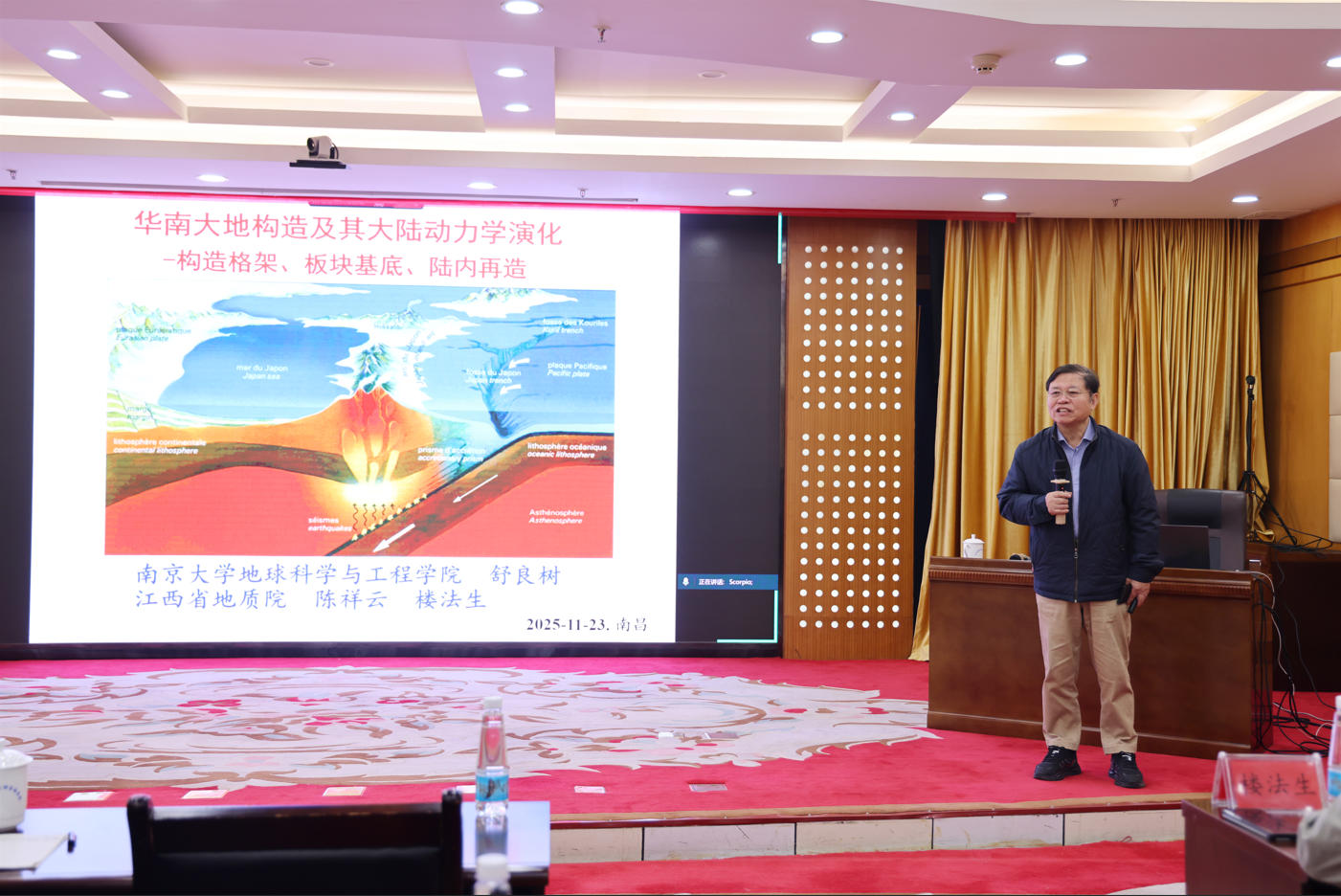 南京大学教授、博士生导师,中国地质学会理事、大陆地壳与地幔委员会主任舒良树受邀作《华南大地构造及其大陆动力学演化》报告。报告对板块构造、微板块等几个重要基本概念以及三级边界断裂与单元划分进行了介绍,针对华南前泥盆纪基底地质特征、陆内再造与大陆动力学演化进行了重点论述。报告深入浅出,从边界断裂类型、基底时代、构造属性、造山带构成等方面交流了最新研究成果,使大家深受启发,也为我省地质勘查工作在华南地质构造方面的进一步研究打开了新思路。