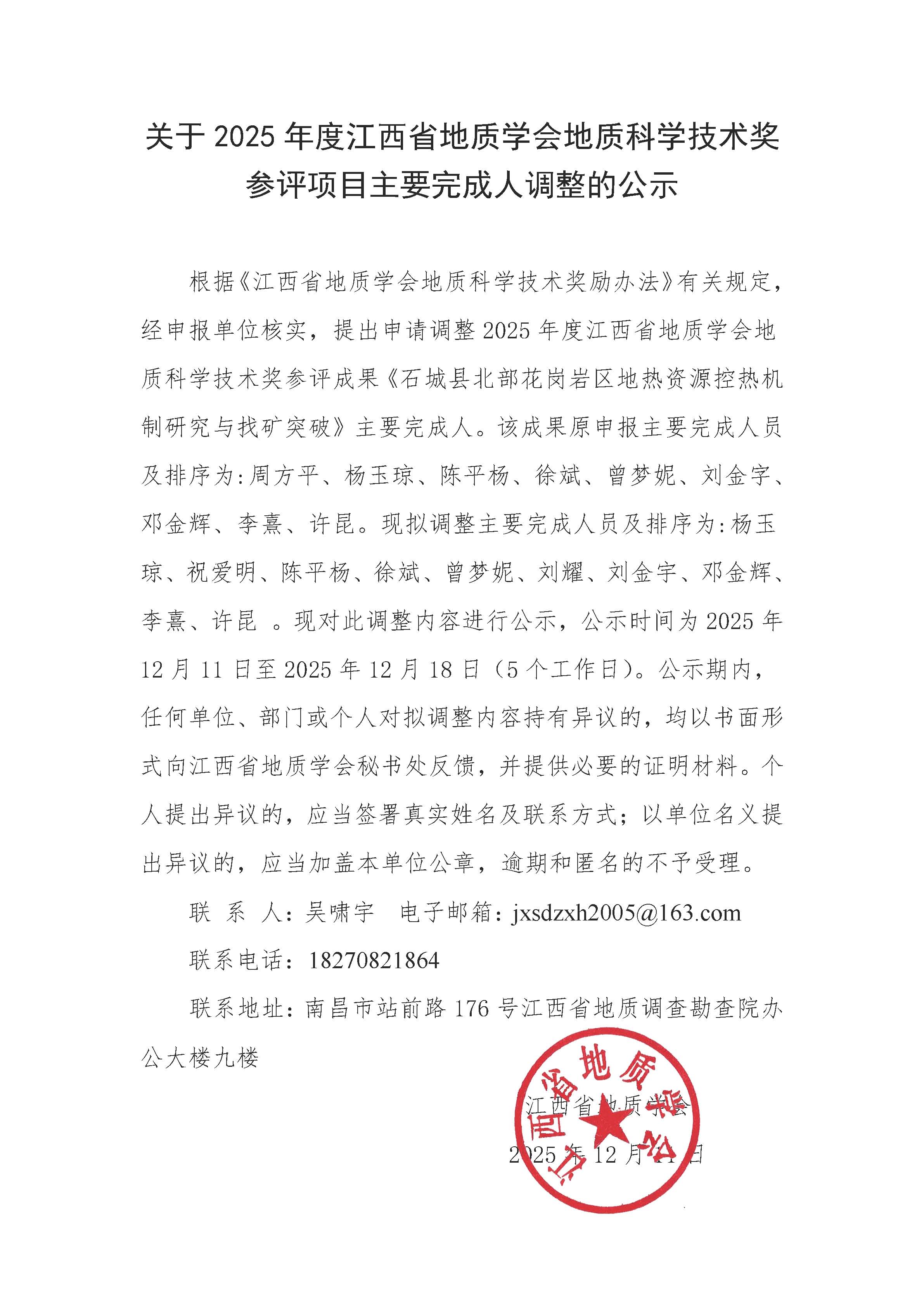 下一篇:2025年度江西省地质学会地质科学技术奖及青年地质科技人才奖终评结果公示